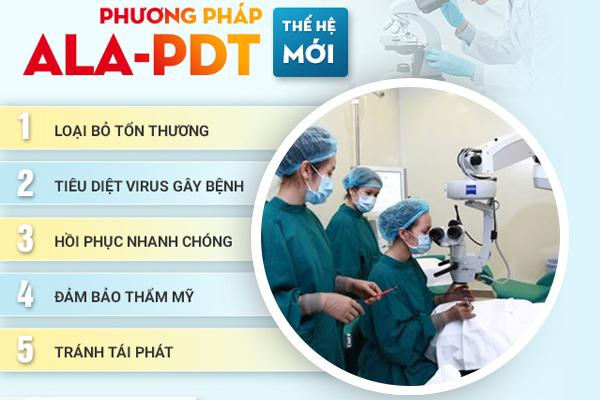 ALA-PDT là công nghệ điều trị tiên tiến sử dụng thuốc cảm quang (ALA) kết hợp ánh sáng đặc biệt để tiêu diệt virus HPV gây sùi mào gà, đồng thời kích thích hệ miễn dịch tự nhiên của cơ thể.